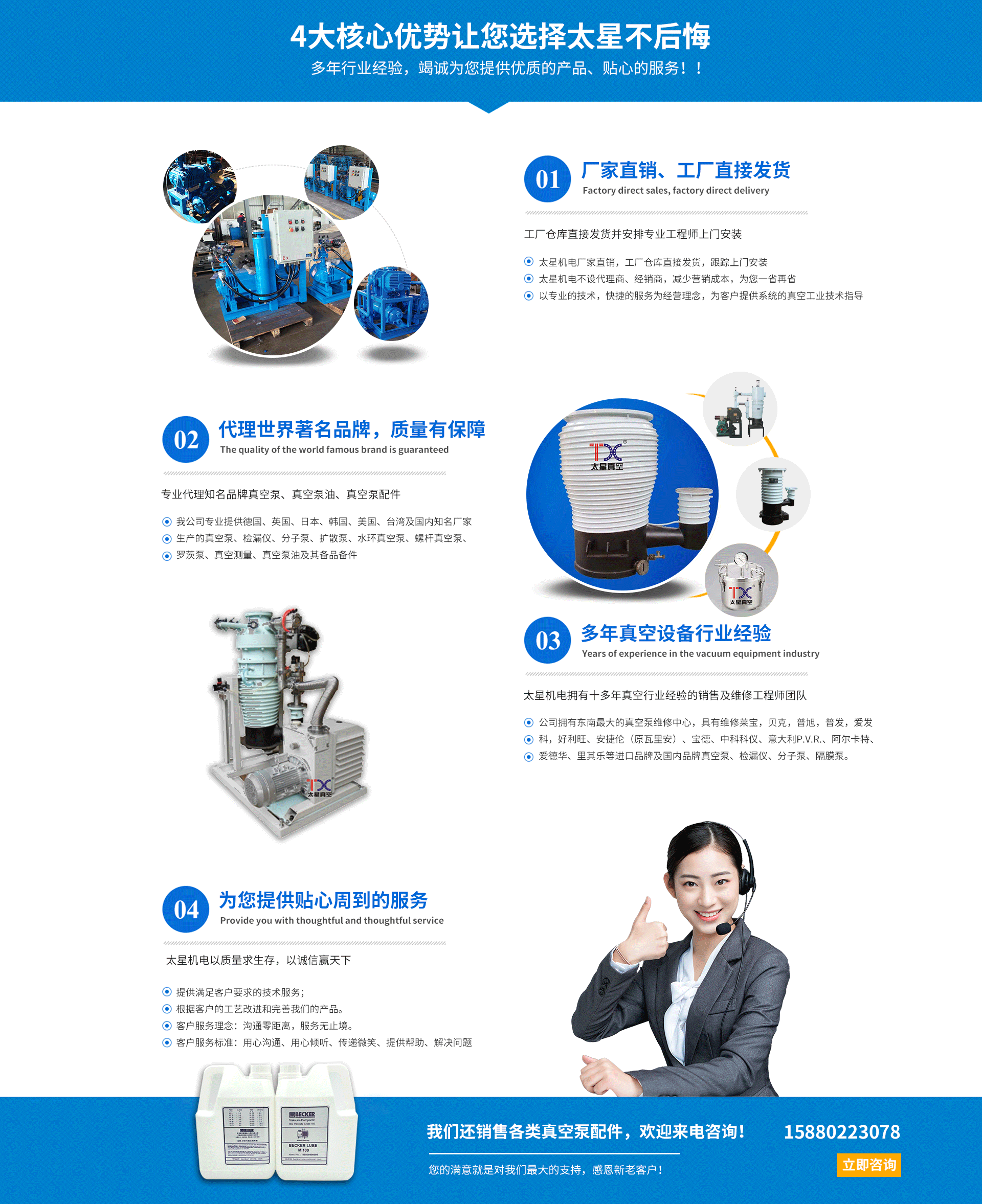 廈門太星機電有限公司于2009年成立于廈門集美,是一家真空工業(yè)服務(wù)企業(yè)。廈門太星機電有限公司擁有一批技術(shù)維修團隊,在維修方面有精湛、豐富的技術(shù)經(jīng)驗,標(biāo)準(zhǔn)的維修車間,標(biāo)準(zhǔn)的維修工具,規(guī)范的作業(yè)流程。為客戶提供完善可靠的服務(wù),以精致維修,價格合理,提升真空設(shè)備的使用價值。 廈門太星機電有限公司真空工業(yè)銷售和服務(wù)。以技術(shù)雄厚的服務(wù)能力廣受客戶的認(rèn)可,應(yīng)用于上百家客戶,提供了優(yōu)良的服務(wù),應(yīng)客戶需求定制價值高的真空工業(yè)解決方案。 主營范圍: 1、銷售真空泵、真空配件、真空泵油、耗材、真空部件; 維修保養(yǎng)干泵、分子泵、旋片泵、機械泵、羅茨泵、渦旋泵、氦質(zhì)譜檢漏儀、羅茨風(fēng)機、隔膜泵、柱塞泵、水環(huán)泵、真空儀器、真空閥門等真空設(shè)備; 真空系統(tǒng)的定制、優(yōu)化、改造、升級。 真空系統(tǒng)檢漏服務(wù); 非標(biāo)真空工程的規(guī)劃、設(shè)計、施工、調(diào)試、培訓(xùn)服務(wù); 3D打印機及3D打印服務(wù); 2、進口真空泵的銷售、維修和保養(yǎng)的一條龍服務(wù),如Agilent安...